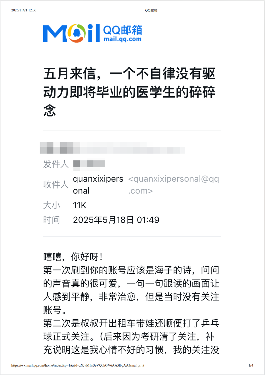 来信邮箱:quanxixipersonal@qq.com每个月回复一封来信,前11个月的回信在合集里。关注我,明年1月回信再见!