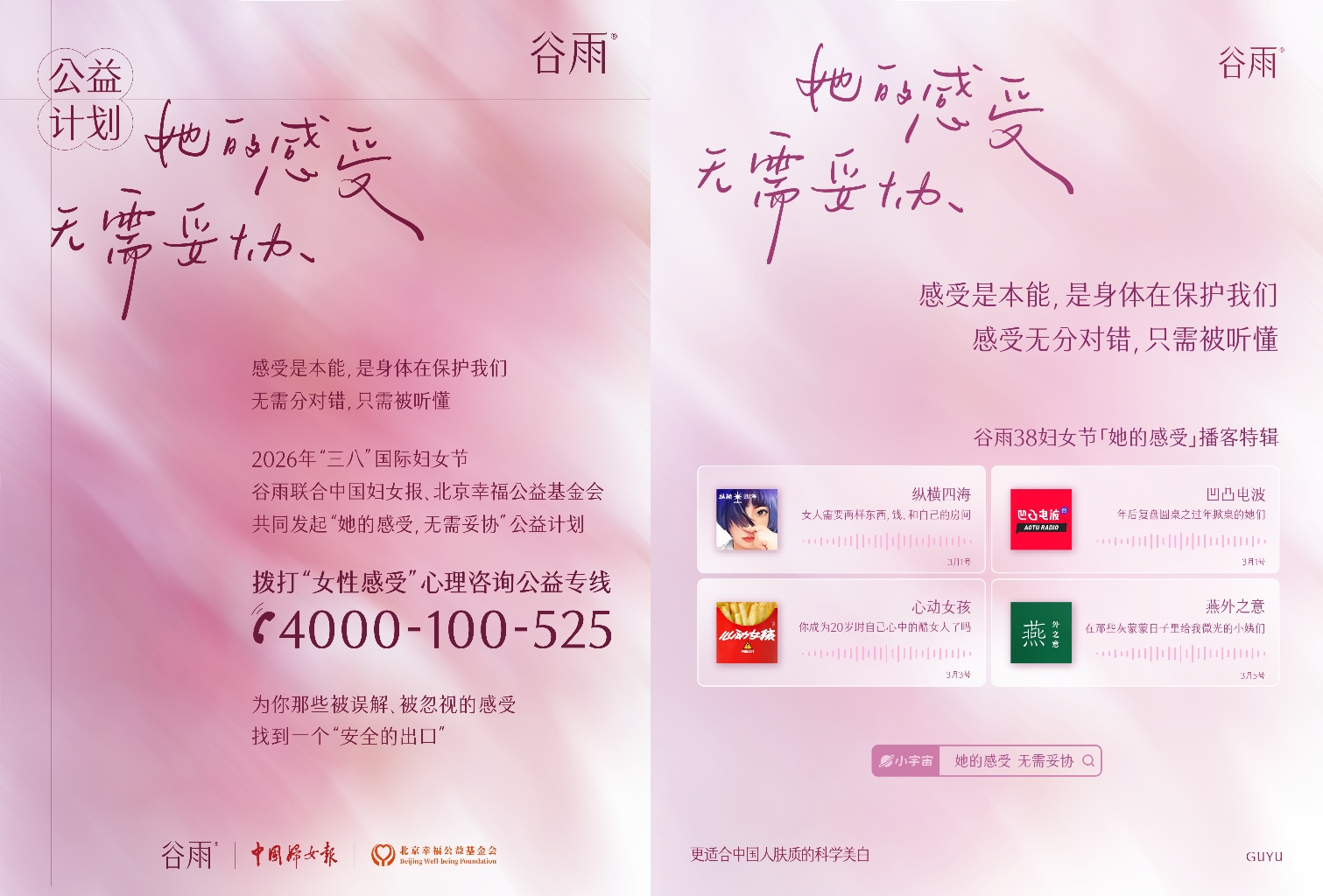 今年三八妇女节,谷雨和中国妇女报、北京幸福公益基金会联合发起#她的感受,无需妥协#公益计划,呼吁正视和尊重女性感受的同时,也面向所有女性开通了一条【女性感受心理咨询公益专线】,为女性感受提供了一个安全、专业的情绪出口。