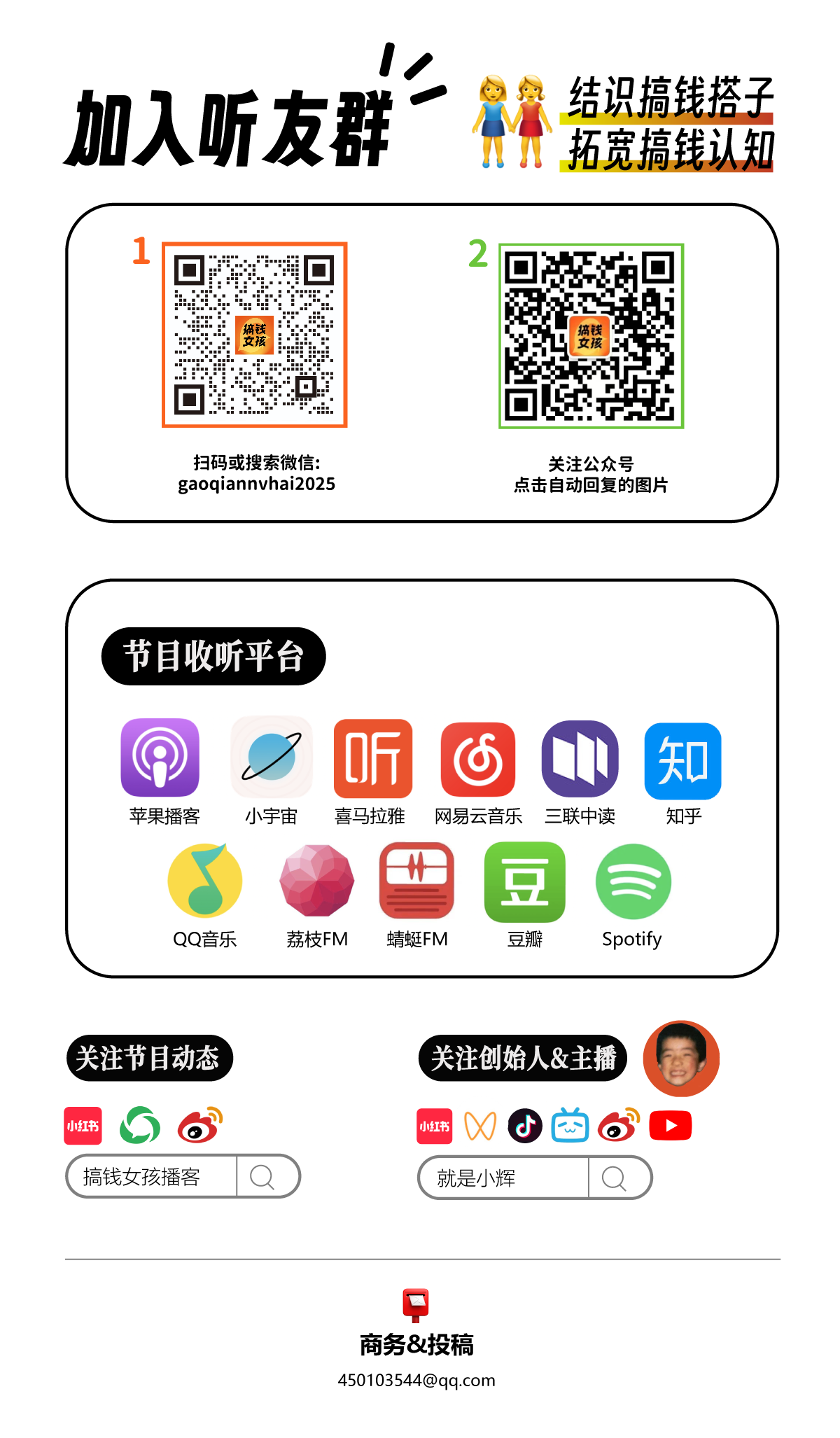 欢迎加入我们的听友群,成为“搞蜜”!可以关注公众号【搞钱女孩播客】,扫描自动回复的图片上的二维码,就可以加到小助手,邀请你入群。每天加的人太多了,如显示添加频繁,请耐心等待。