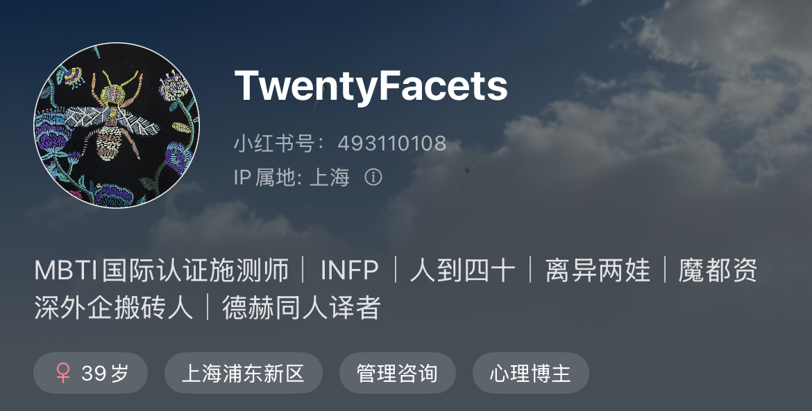 👩KK:MBTI国际认证施测师|INFP|人到四十|离异两娃|魔都资深外企搬砖人|德赫同人译者|TwentyFacets