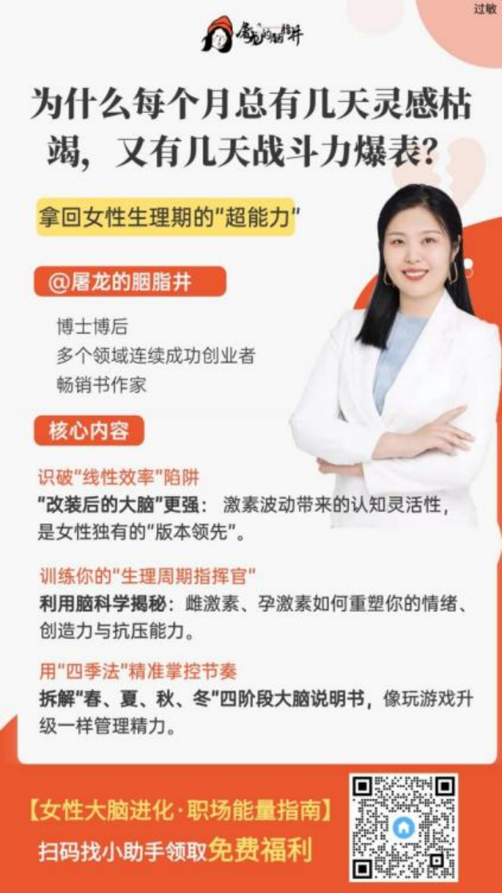 想要系统解锁月经周期的 “超能力”,顺生理节律提升效率,同时读懂男女大脑差异?可以关注脑科学专家屠龙老师的系列课程,从脑科学角度,给出全场景适配方案:
